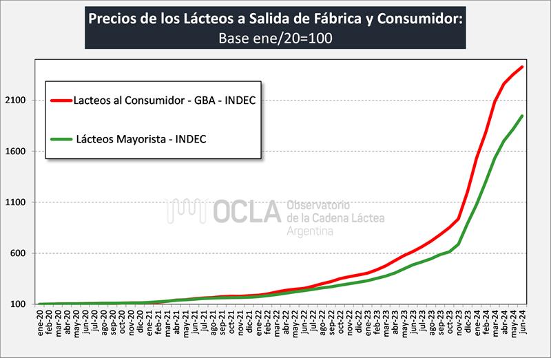 El índice mayorista de precios de los Lácteos registró un aumento de 7,2% en junio de 2024 respecto del mes anterior, se incrementó un 118,2% en el primer semestre del año y la comparación anual con junio de 2023 arrojó un incremento del 300,4%.