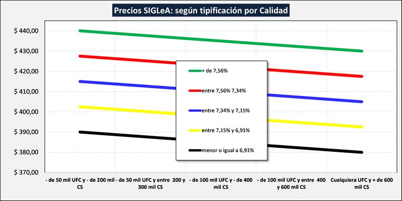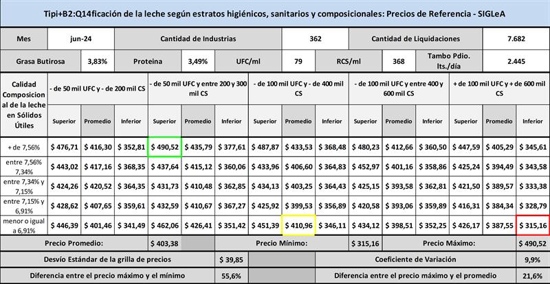 En el cuadro de tipificación, la leche comercializada se divide en 25 estratos según composición y calidad higiénico-sanitaria y, dentro de cada estrato, se muestra un promedio ponderado del precio del total de esos litros y además un promedio ponderado del 20% superior e inferior de los precios.