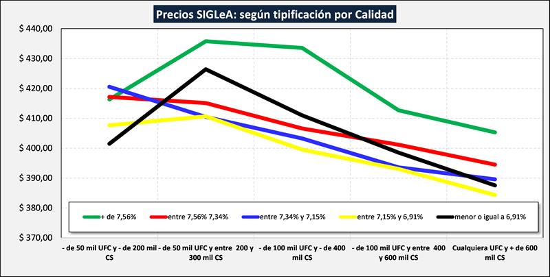 En el gráfico de arriba se presentan en 5 curvas por Tipo de leche en función a los sólidos útiles (grasa butirosa + proteína), los diferentes precios en función a la calidad higiénico-sanitaria (UFC/ml y RCS/ml). Se puede observar que existen precios descendentes en cada tipo composicional a medida que desmejora la calidad higiénico-sanitaria, pero se dan algunos serruchos ya que las “penalizaciones” por menor calidad se ven compensadas seguramente por la presencia de bonificaciones comerciales que pueden estar especificadas y tabuladas (ejemplo: volumen, temperatura, distancia, permanencia, etc.) o arbitrarias en función a aspectos no especificados en los Sistemas de Tipificación y Pago de la Leche (netamente comerciales).