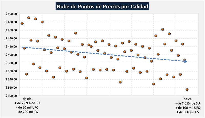Si elaboramos una nube de puntos con los diferentes precios disponibles en función a las calidades, podemos observar que se da una pendiente descendente de precios a medida que es menor la calidad integral de la leche, pero esa pendiente podría ser mucho más pronunciada si se pretende mejorar/incentivar la mejor calidad de leche.