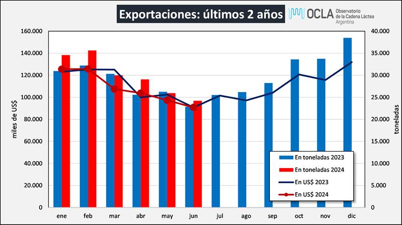Las exportaciones de productos lácteos en junio de 2024 que totalizaron 24.220 toneladas de productos, por un valor de US$ 90,8 millones, bajaron 6,6%, y 6,7% en volumen de productos, y en monto total en dólares, respectivamente, comparadas con el mes anterior.