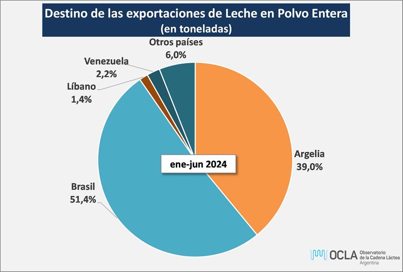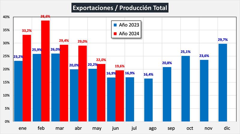 En litros de leche equivalentes (ene-jun 2024), las exportaciones crecieron el 13,0% y representaron el 28,3% de la producción total (en el primer semestre de 2023 representaron el 21,9%). En particular, en junio de 2024 las exportaciones tuvieron una participación del 19,6% sobre la producción total del mes.