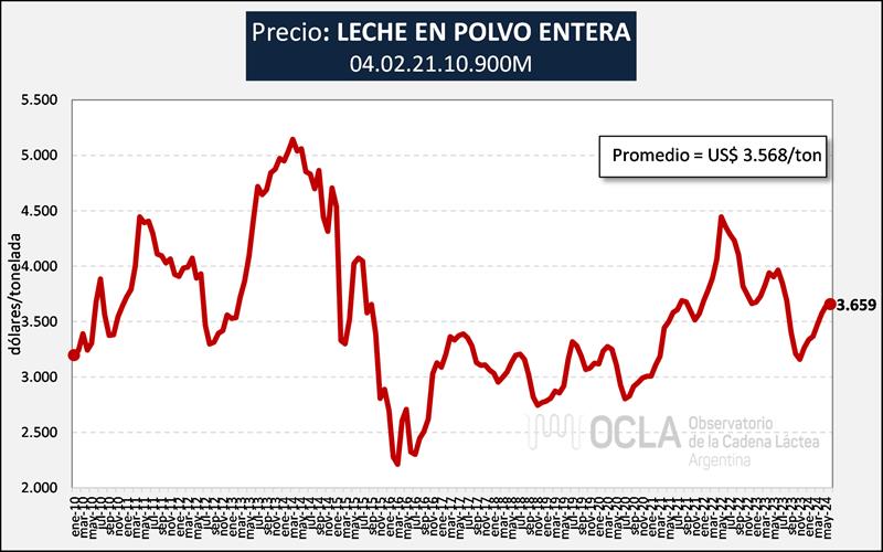 En el gráfico siguiente se puede observar la evolución del precio de la Leche en Polvo Entera en bolsas de 25 kgs. con el nomenclador Común Arancelario 04.02.21.10 900M actualizado hasta el mes de junio de 2024: