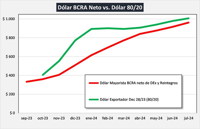 Debemos estar muy atentos a la evolución del tipo de cambio que luego de la fuerte devaluación en diciembre 2023, se viene ajustando a un ritmo muchísimo más lento que la inflación y posiblemente de continuar esta situación volvamos a valores de septiembre de 2023 (cuando había fuerte retraso cambiario y vigencia de derechos de exportación y reintegros) en julio, como puede verse en la simulación que realizamos en el gráfico siguiente, comparando el tipo de cambio efectivo de septiembre 2023 al cual actualizamos a julio 2024 por IPC con el tipo de cambio del Decreto 28/23 (80% mayorista BCRA y 20% Contado con Liquidación), los valores se igualan en julio, lo cual implica que se pierden las ventajas competitivas logradas por la devaluación de diciembre y por la suspensión de derechos de exportación.