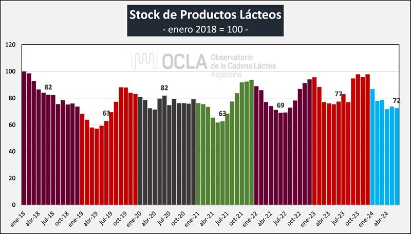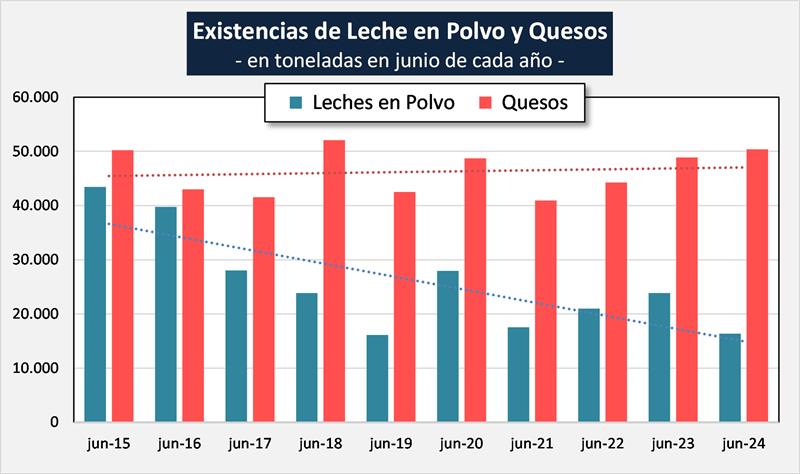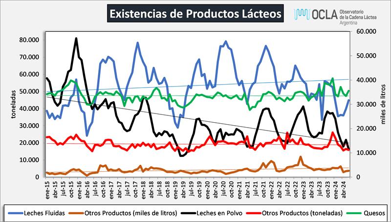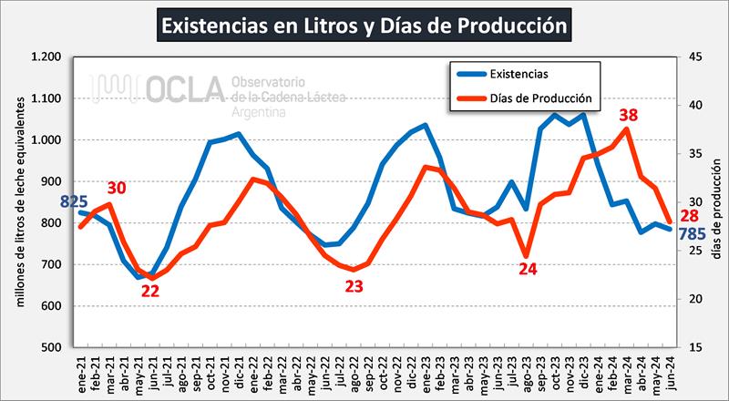 En el mes de junio de 2024 las existencias fueron 0,6% superiores al mes anterior en volumen de productos y en litros de leche equivalentes estuvieron en 785 millones de litros de leche equivalentes, un 1,6% por debajo de mayo de 2024. Respecto al interanual, junio 2024 estuvo -6,2% y -6,4% en volumen y litros de leche equivalentes respectivamente respecto de junio de 2023.
