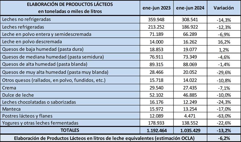 Según los datos del cuadro hay una caída en el primer semestre del 13,2% en productos elaborados y del 6,2% en litros de leche necesarios para elaborarlos (6,7% en promedio diario). Cabe recordar que la producción total a nivel nacional descendió en igual período un 13,1%.
