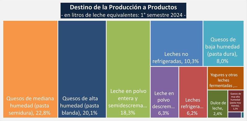 Por último, en el gráfico de abajo vemos la distribución porcentual a cada producto en litros de leche equivalentes, quesos 52%, leches en polvo 25%, leches fluidas 17% y resto de productos el 6%.