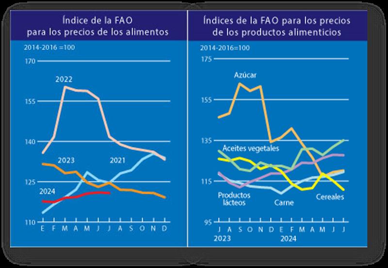 El índice de precios de los productos lácteos de la FAO registró en julio un promedio de 127,7 puntos, manteniéndose casi invariado desde junio y ubicándose 8,6 puntos (un 7,2 %) por encima de su valor de hace un año, ya que el descenso de las cotizaciones de las leches en polvo prácticamente compensó el aumento de las de la manteca y el queso. Las cotizaciones mundiales de las leches en polvo descendieron en julio, como consecuencia de la atonía de la demanda de importaciones, sobre todo de suministros al contado, en parte debido a la pausa estival de la actividad comercial en Europa occidental, pese a la escasez de existencias y al descenso estacional de la producción lechera en Oceanía. Por el contrario, las cotizaciones internacionales de la manteca aumentaron de forma moderada por décimo mes consecutivo a raíz de las limitadas disponibilidades exportables, principalmente en Europa occidental, como resultado de la solidez de las ventas internas, la escasez de existencias y la caída estacional de la producción lechera. Por su parte, los precios mundiales del queso aumentaron ligeramente, debido sobre todo al volumen elevado de las ventas internas en Europa occidental.