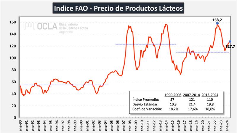Por su parte el gráfico siguiente muestra el valor promedio de enero-julio de cada año del índice de precios de los lácteos de FAO de los últimos 25 años (2000-2024):
