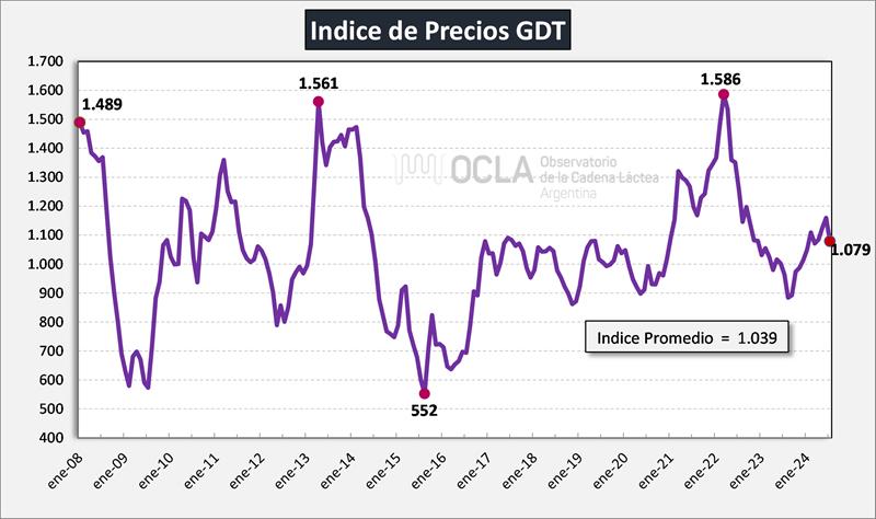 Cabe acotar que los precios de FAO promedian varias commodities de mercados como Nueva Zelanda, Estados Unidos y la Unión Europea. El Índice del GDT de Nueva Zelanda presentó mejoras de precios a partir de septiembre 2023. La situación de marzo y abril cambió y los índices presentaron una baja, que se recuperó en mayo y junio y vuelven a caer en julio.