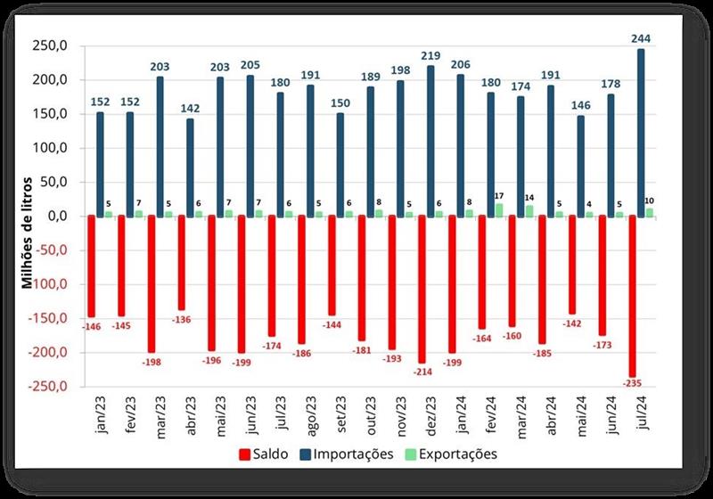 En julio, las importaciones de lácteos mostraron un nuevo aumento, generando una nueva caída en la balanza comercial láctea. Según datos difundidos por la Secretaría de Comercio Exterior (SECEX), el saldo registrado en el mes alcanzó -235 millones de litros en equivalente de leche, registrando una disminución mensual de 62 millones de litros con relación a junio, como se puede observar en el gráfico.