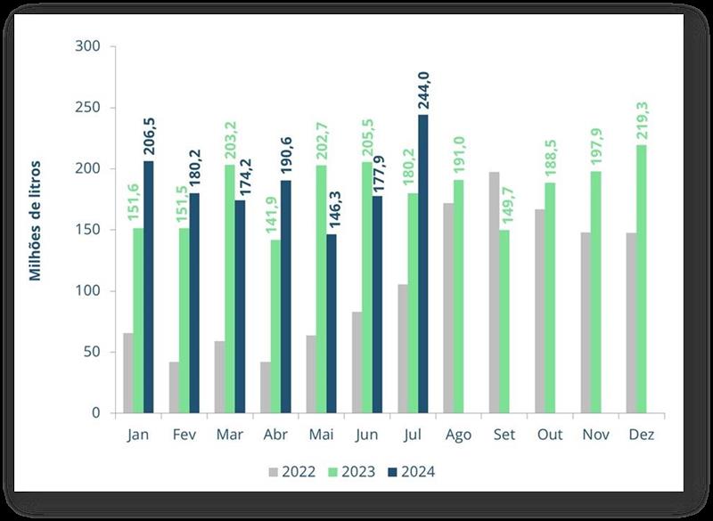 Las importaciones en julio continuaron mostrando un crecimiento mensual significativo. En total, se importaron alrededor de 244,0 millones de litros equivalentes de leche, registrando un incremento mensual de 37,2% y un incremento anual de 35,4%, siendo este el valor más alto registrado para las importaciones de lácteos en la serie puesta a disposición de COMEXSTAT, como se muestra en el gráfico siguiente.
