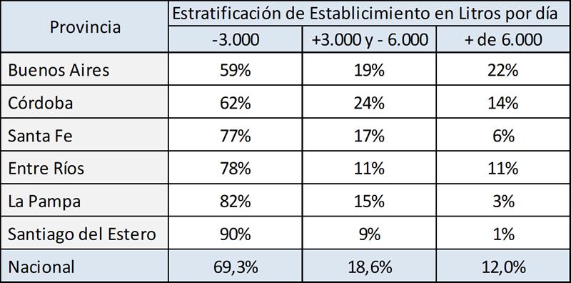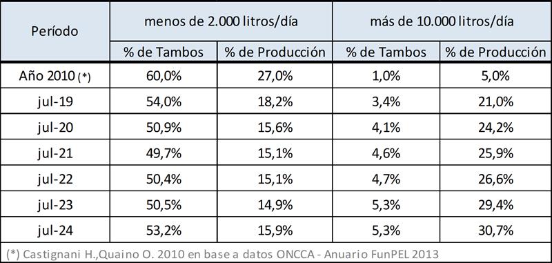 Puede verse en el cuadro siguiente al comparar con datos disponibles del año 2010, que en un extremo disminuye la participación tanto en cantidad de tambos como en el volumen de producción de las unidades productivas de menos de 2.000 litros diarios y en el otro extremo de la estratificación, se incrementa la participación de las unidades de más de 10.000 litros diarios, situación esta última, atemperada por la baja de producción en este último año.
