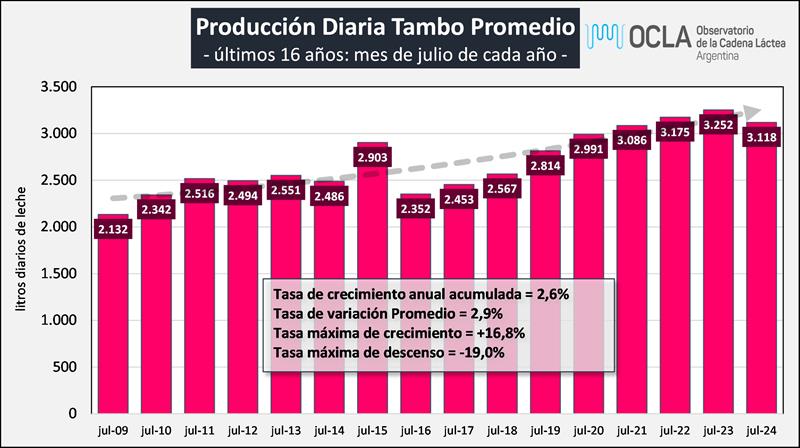 Sobre la base de la producción mensual y la cantidad anual de tambos (SENASA), podemos inferir el tamaño del tambo promedio, unos 3.118 litros de leche diarios para julio de 2024, una producción inferior al año anterior (-4,1%). En el período 2016-2023 el tambo promedio creció a una tasa del 4,7% anual, situación que se ve interrumpida en 2024 por los efectos mencionados en nuestros informes anteriores.