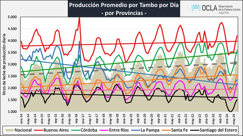 Por último, en el gráfico de abajo se muestra la tendencia en la evolución del tambo promedio nacional y por provincia, donde hay provincias como Córdoba con una importante tendencia al crecimiento (mayo R cuadrado), en la producción de sus unidades productivas, seguida por Santa Fe y luego el resto con una tendencia estable y un solo caso negativa.