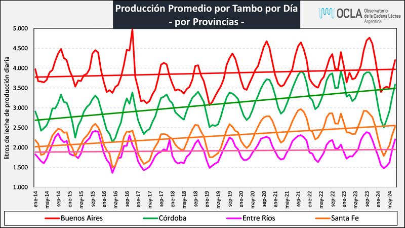 A continuación, el gráfico con las 4 principales provinciales lecheras (+ del 95% de la leche total) que permite ver con mayor nitidez la evolución.