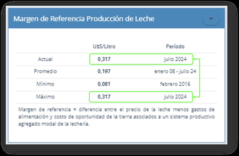 En el cuadro puede observarse que el margen promedio para el mes de julio del 2024 fue US$ 0,317/litro de leche, este margen es un 1,0% superior al del mes anterior y un 27,0% superior respecto al de igual mes del año anterior. Además, está 60,9% por encima del promedio y es el valor más alto registrado desde que se elabora esta serie (17 años y medio).