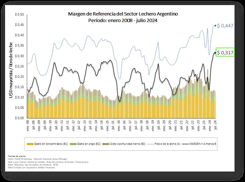 A partir de dicho antecedente, se realizó una adaptación para la lechería de Argentina, que se ha denominado “margen de referencia” el cual se calcula como la diferencia entre el precio de leche oficial y un vector de gastos que incluye alimentación suplementaria (concentrados y silaje) y el costo de oportunidad de la tierra.