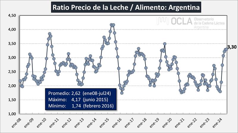 Visto como relación entre el precio de la leche y el costo de alimentación calculado, surge el siguiente gráfico: