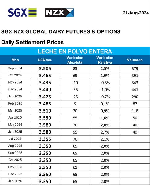 Mercado de Futuros NZX – Leche en Polvo Entera 21/8/2024