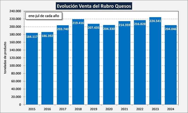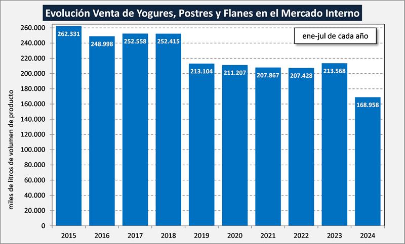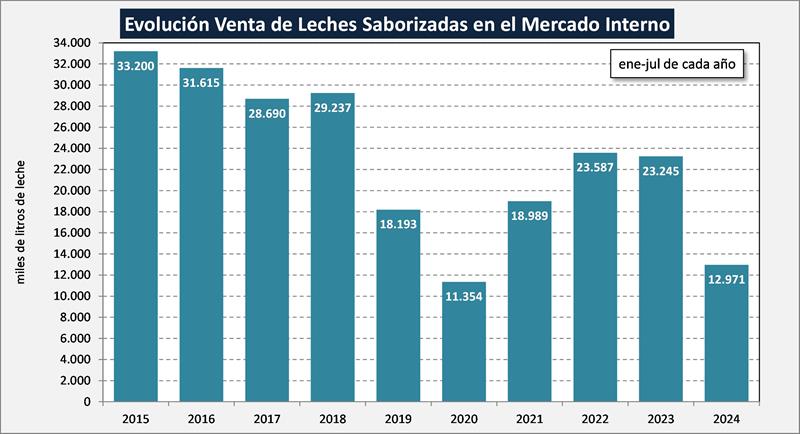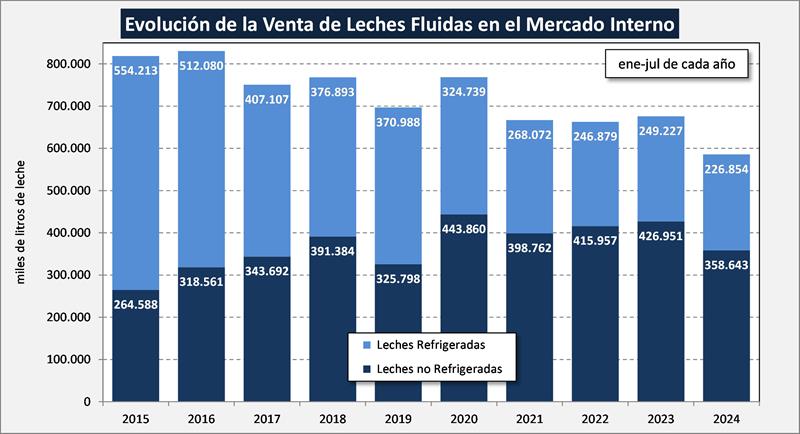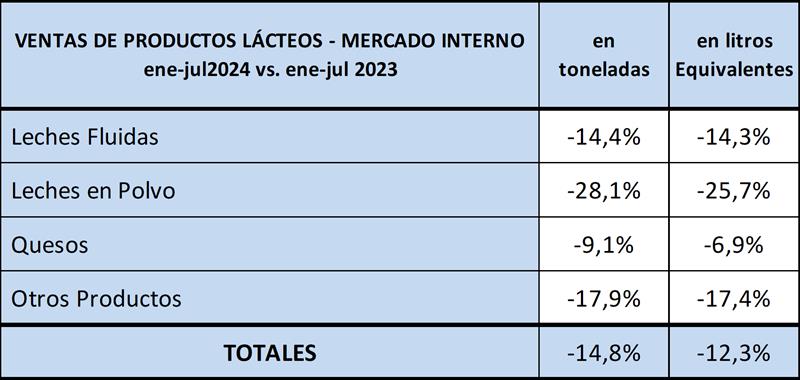 El acumulado del período enero-julio del 2024 muestra en el cuadro de arriba una caída del 14,8% en volumen de productos y del 12,0% en litros de leche equivalentes (-12,7% en el promedio diario).