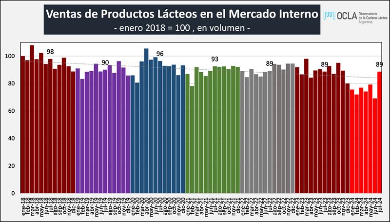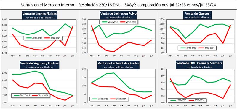 Las ventas según la Resolución 230/16 de la DNL presentaron para el mes de julio de 2024 un volumen 28,0% superior al mes pasado y en litros de leche equivalente crecieron un 25,1% en la comparación total mensual y un 21,0% en el promedio diario.