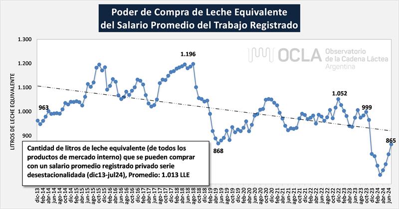 En el gráfico siguiente se compara el Valor del Litro de Leche Equivalente comercializado en el Mercado Interno y se lo compara con el Salario Registrado. En los últimos meses se nota un incremento del poder adquisitivo del mismo medido en Litros de Leche Equivalentes (LLE).