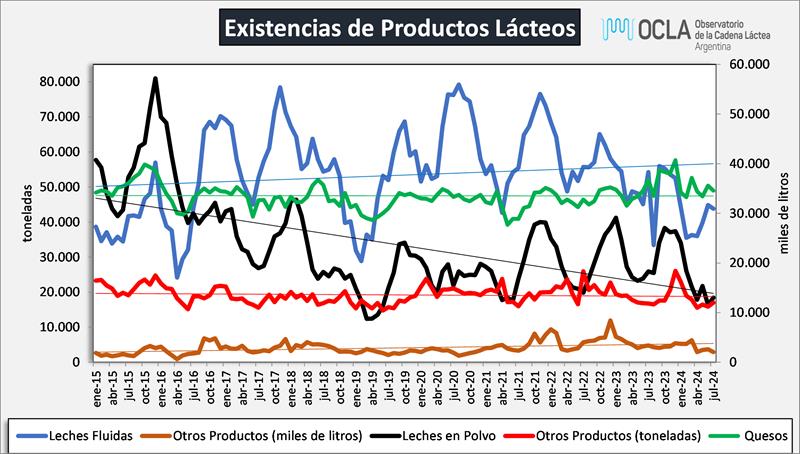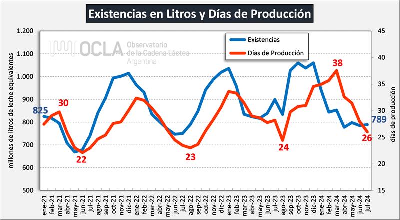 En el mes de julio de 2024 las existencias fueron 0,4% superiores al mes anterior en volumen de productos y en litros de leche equivalentes estuvieron en 789 millones de litros de leche equivalentes, un 0,5% por encima de junio de 2024. Respecto al interanual, julio 2024 estuvo -13,9% y -12,2% en volumen y litros de leche equivalentes respectivamente respecto de julio de 2023.