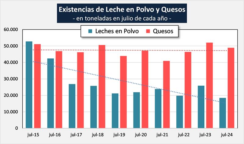 Evolución de las existencias de leches en polvo (enteras y descremadas) y quesos (duros, semiduros, blandos y muy blandos) a julio de los últimos 10 años: