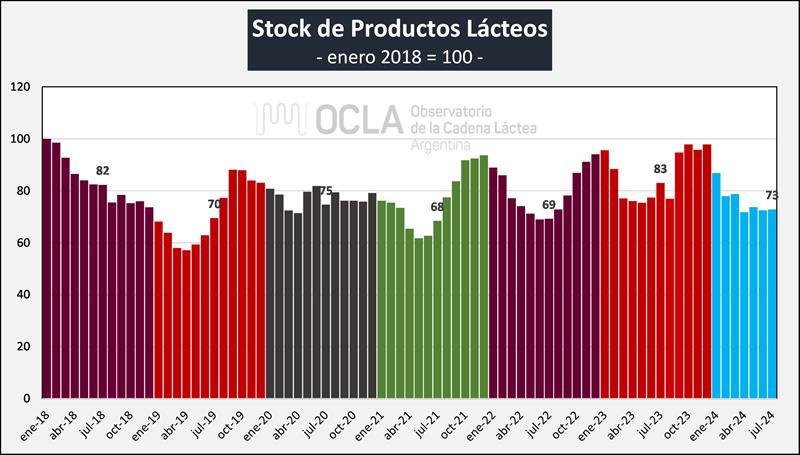Al mes de julio de 2024 los stocks iniciales cayeron un 26,5% en volumen de productos y 25,6% en litros de leche equivalentes.