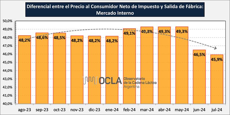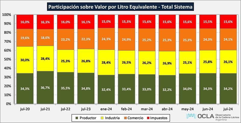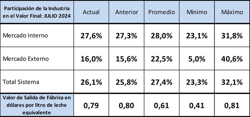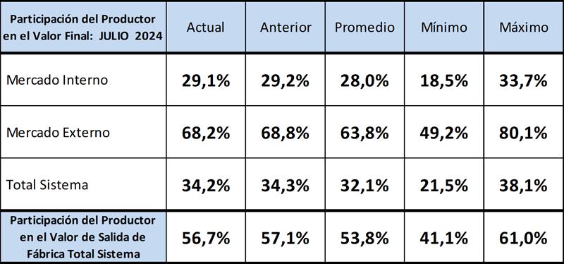 La participación del productor en el total del sistema fue para julio de 2024 del 34,2%, 0,1 puntos por debajo del mes anterior, y 2,1 puntos por encima de la media del 32,1%. Desmejora muy levemente los valores finales de mercado interno (-0,1) y los de mercado externo cayeron 0,6 puntos porcentuales, pero siguieron muy por encima de la media histórica de la serie disponible (63,8%). La participación del productor sobre el valor de salida de fábrica (precio al que vende la industria) fue de 56,7%, 0,4 puntos por debajo del mes anterior y 2,9 puntos por arriba del promedio de la serie (53,8%).