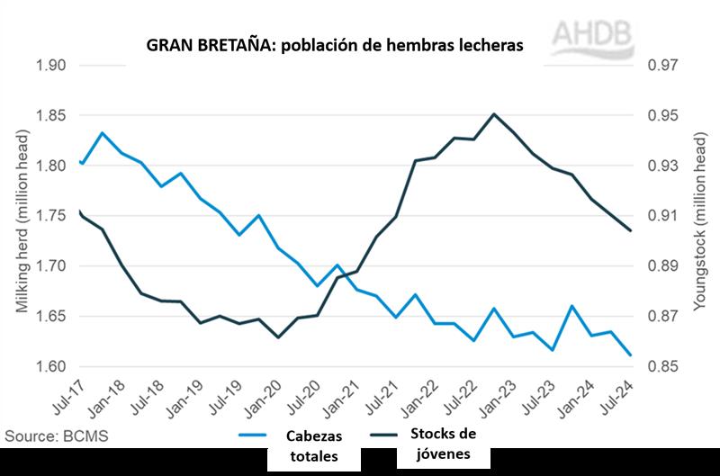 Las últimas cifras del BCMS registran el rodeo lechero de GB en 1,61 millones de cabezas, al 1 de julio de 2024. Esto supone una reducción del 0,3 % respecto del año anterior, impulsada por disminuciones en todas las categorías de edad, excepto la de 2 a 4 años. La edad media de una vaca en el rebaño lechero de GB se sitúa ahora en 4,55 años, muy ligeramente más joven que la cifra del año pasado.