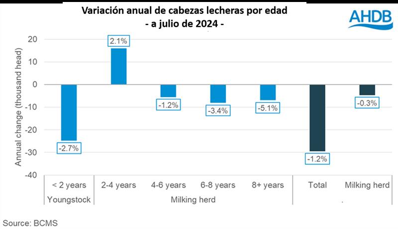 Gráfico que muestra el cambio interanual en la población lechera por categoría de edad