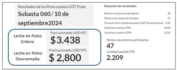 La subasta Nº 060 se ha llevado ha cabo en el día de hoy, martes 10 de septiembre, donde el precio promedio obtenido para la LPE ha sido de 3.438 S$/t, el cual representa una caída de 3,7% respecto a lo publicado en la última GDT pulse (3.569 US$/t) y es 1,2% arriba respecto al último evento del GDT (3.396 US$/t).