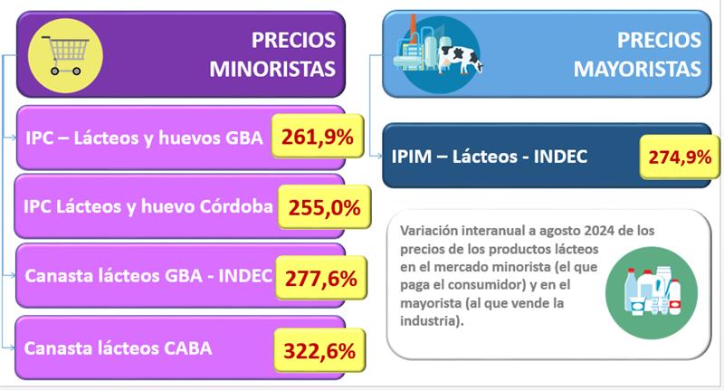 El índice mayorista de precios de los Lácteos registró un aumento de 2,7% en agosto de 2024 respecto del mes anterior, se incrementó un 89,7% en los ocho primeros meses del año y la comparación anual con agosto de 2023 arrojó un incremento del 274,9%.