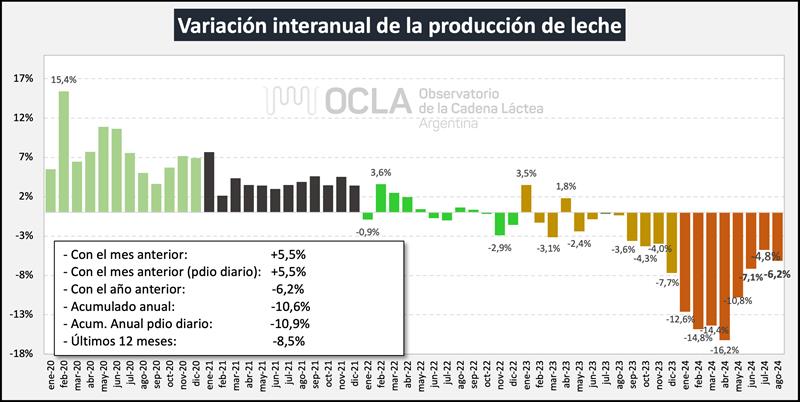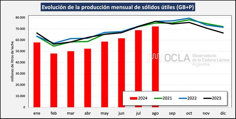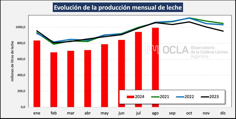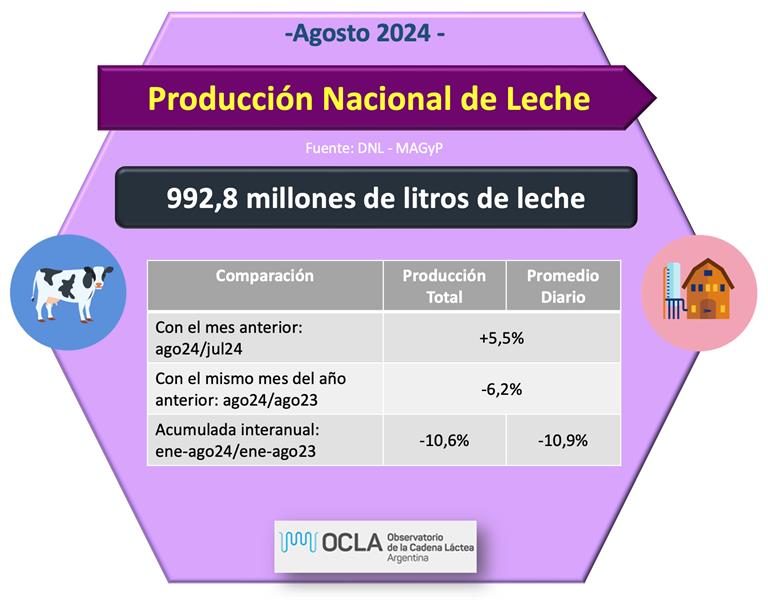 En el mes de agosto del 2024 la producción fue de 992,8 millones de litros de leche, esto implica un valor 5,5% por encima del mes anterior (igual en el promedio diario) y un 6,2% menos que igual mes del año anterior.