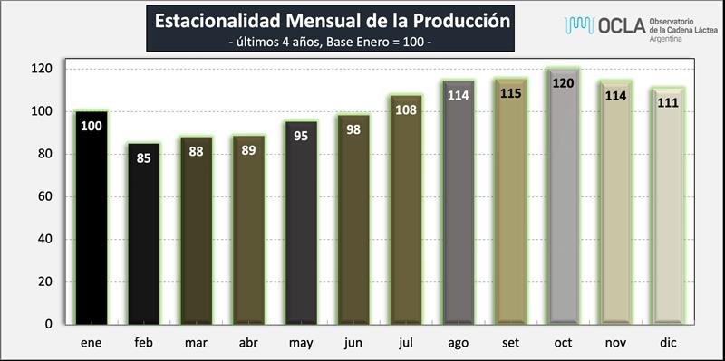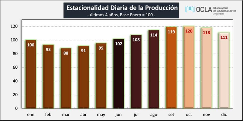 Como es habitual, la producción desde el pico de máxima en octubre, cae a una tasa del 5% mensual hasta marzo/abril (tomando el promedio diario de producción, para que no afecten la cantidad de días de cada mes), donde luego comienza un nuevo repunte hacia octubre.