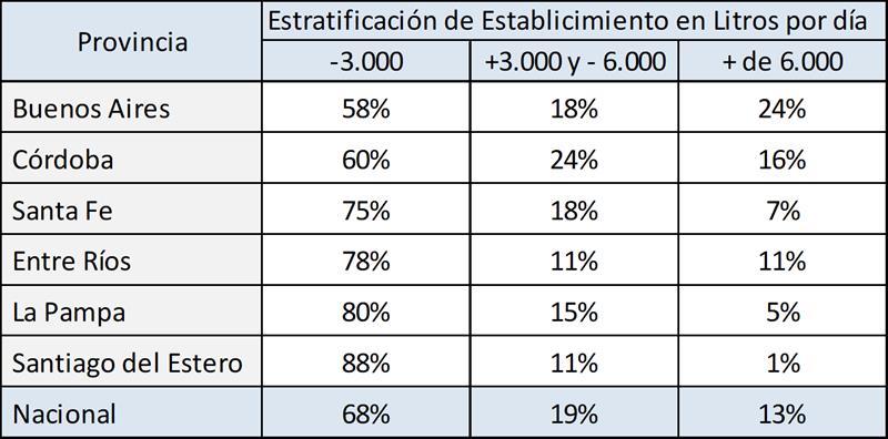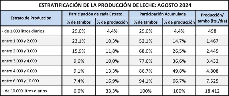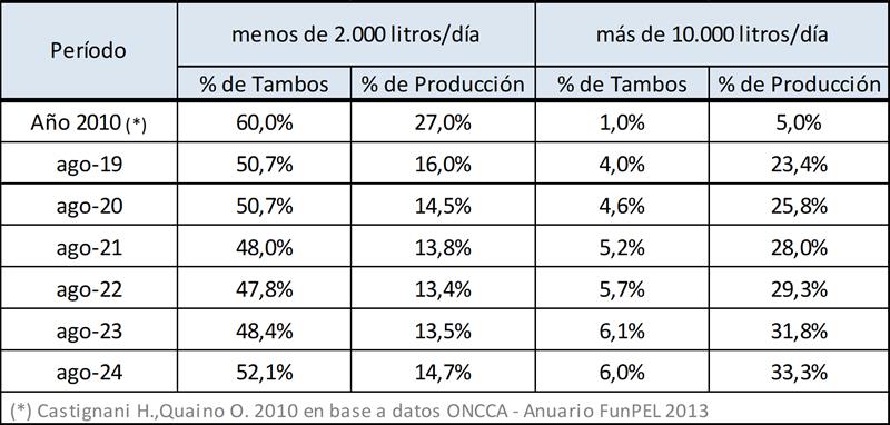 Puede verse en el cuadro siguiente al comparar con datos disponibles del año 2010, que en un extremo disminuye la participación tanto en cantidad de tambos como en el volumen de producción de las unidades productivas de menos de 2.000 litros diarios y en el otro extremo de la estratificación, se incrementa la participación de las unidades de más de 10.000 litros diarios, situación esta última, atemperada por la baja de producción en este último año.