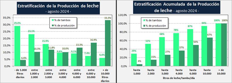 En el cuadro se presenta la participación de los tambos en función a su tamaño medido en litros de leche diarios del mes de agosto de 2024 sobre la base SIGLeA - LUME: