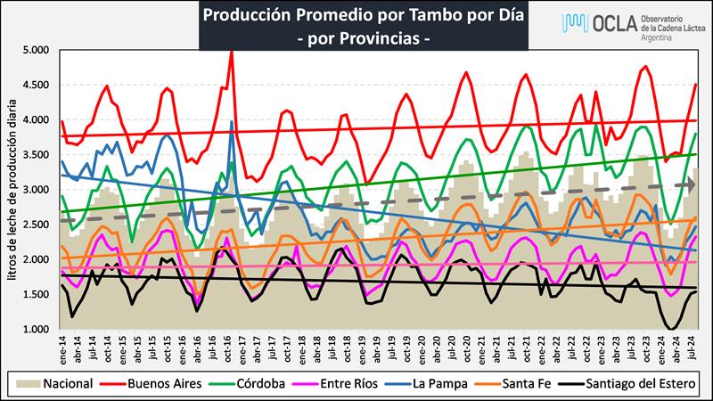 Sobre la base de la producción mensual y la cantidad anual de tambos (SENASA), podemos inferir el tamaño del tambo promedio, unos 3.371 litros de leche diarios para agosto de 2024, una producción inferior al año anterior (-1,2%), lo cual marca a las claras que la caída interanual del 6,2% se da fundamentalmente por la menor cantidad de unidades productivas y por menos vacas en las unidades productivas en actividad. En el período 2017-2023 el tambo promedio creció a una tasa del 4,7% anual, situación que se ve interrumpida en 2024 por los efectos mencionados en nuestros informes anteriores.