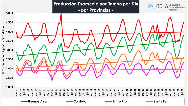 A continuación, el gráfico con las 4 principales provinciales lecheras (+ del 95% de la leche total) que permite ver con mayor nitidez la evolución.
