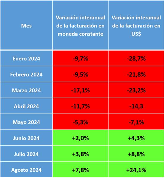 Si analizamos la evolución de la facturación en pesos constantes, mes a mes en lo que va del año 2024, podemos observar que se aceleró la caída en marzo y luego, producto de los mejores precios y una desaceleración en la caída interanual de la producción, la facturación comienza a recomponerse y ya entre junio y agosto se supera al año anterior tanto en pesos constantes como en dólares: