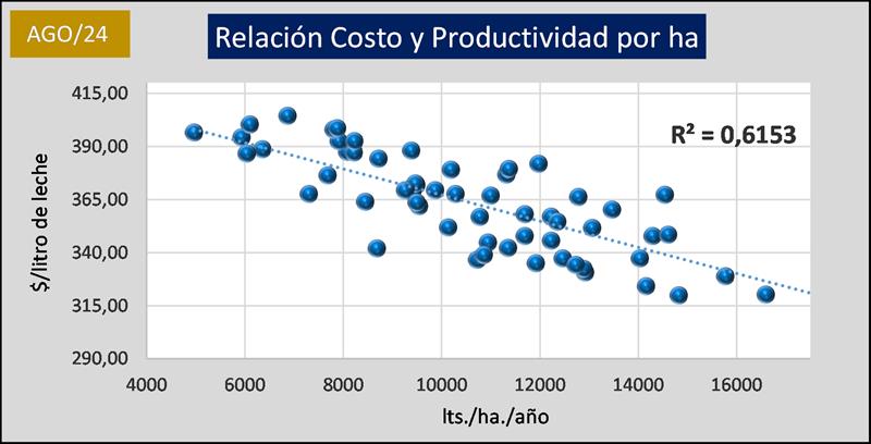 Por último, incorporamos el gráfico donde se obtiene la mayor correlación entre las variables económicas y productivas, en este caso la relación entre la Productividad (medida en litros de leche por hectárea y por año) y los costos de producción.