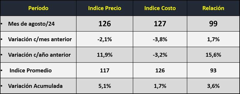Se puede observar una mejora del Indice Precio y una baja del Indice Costo en la variación interanual para agosto, lo que lleva a la Relación entre ambos a mejorar un 15,6% versus agosto de 2023. En el acumulado del año el Indice Precio sube 5,1% pero también sube el Indice Costo un 1,7% lo cual permite que la Relación Precio/Costo mejore en los 8 meses transcurridos del 2024 un 3,6% respecto a igual período del año anterior.
