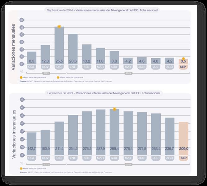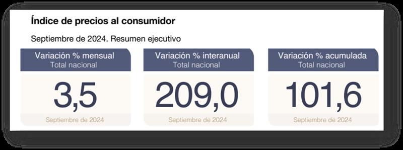El nivel general del Índice de precios al consumidor (IPC) representativo del total de hogares del país registró en septiembre una variación de 3,5% con relación al mes anterior, en el período enero- septiembre del año acumuló una suba del 101,6% y la variación interanual fue del 209,0%.