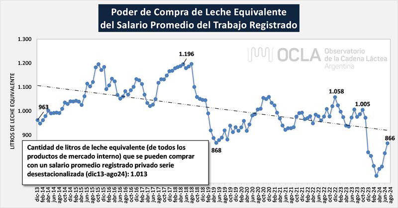 Puede verse claramente, a pesar del repunte de agosto, una desaceleración de los precios de los productos lácteos a nivel minorista que se contraponen con los incrementos de los índices salariales que se vienen dando, lo cual genera una expectativa más promisoria para recuperar los niveles de consumo hacia fin de año, que tuvieron una importante caída en los primeros seis meses de 2024. Aquí se compara el salario promedio desestacionalizado del trabajador registrado y el valor del litro de leche equivalente que calcula IAPUCo que paga el consumidor en el mercado interno y determina el poder de compra de ese salario en litros de leche equivalentes (todos lo productos llevado a litro de leche).