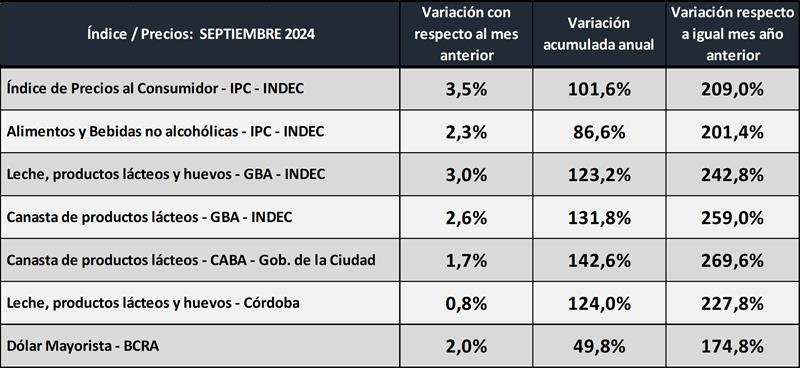 La leche, los productos lácteos y huevos en GBA, crecieron un 3,0% en septiembre de 2024, un 123,2% en el período enero-septiembre y un 242,8% en el interanual. Este índice anual varía por región entre 242,8% y 200,3%.