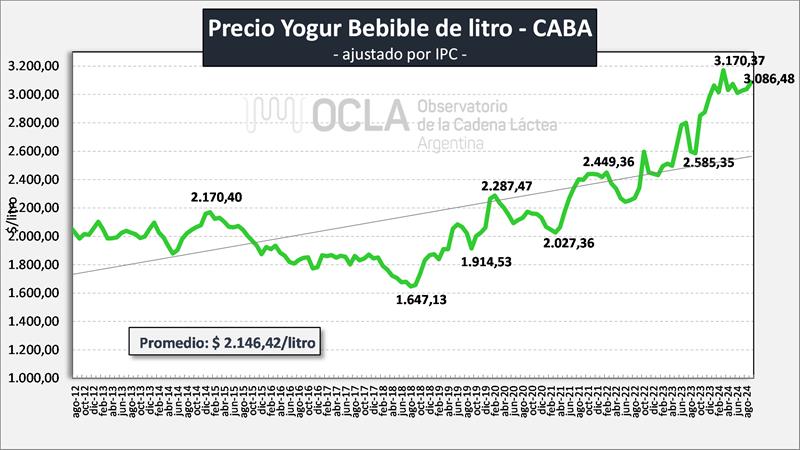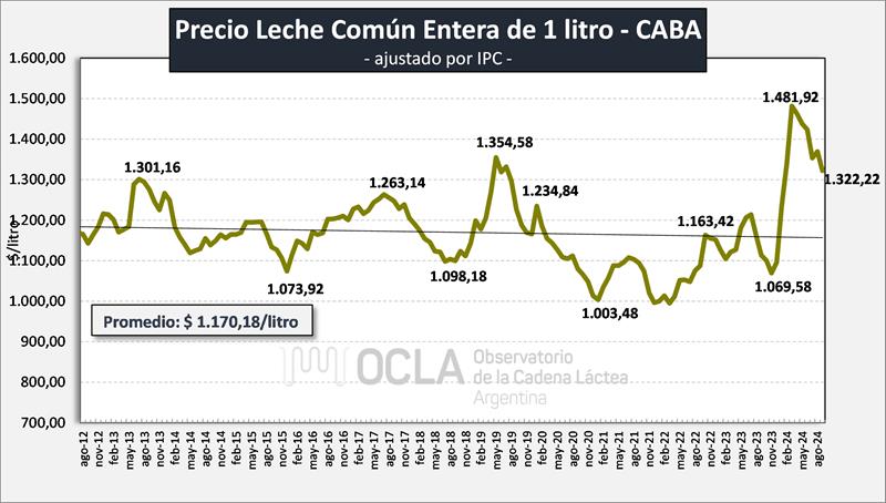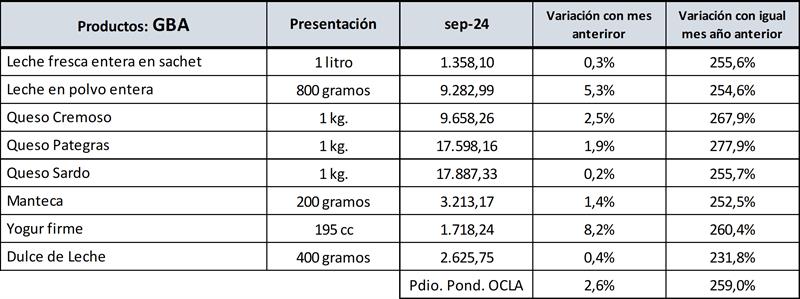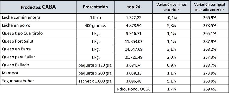 Según datos publicados por la Dirección General de Estadísticas y Censos - Ministerio de Hacienda del Gobierno de la Ciudad de Buenos Aires, los precios de los productos lácteos de esta canasta, tuvieron un crecimiento mensual promedio ponderado del 1,7%, y un incremento interanual del 269,6%. El ponderado es elaborado por OCLA sobre el mismo criterio mencionado para la canasta GBA de INDEC.