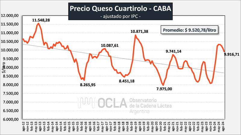 En el caso del queso cuartirolo mantiene una mayor tendencia decreciente en la serie de 13 años. El precio de septiembre fue 4,2% superior a la media histórica disponible y estuvo 14,1% por debajo del máximo alcanzado en 2013 y sosteniendo el proceso de baja en moneda constante en los últimos cuatro meses.