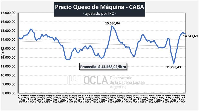 Otro commoditie de mercado doméstico como el queso barra o de máquina presenta un valor 0,4% inferior al mes anterior en moneda constante (dos meses de caída) y es un 7,9% superior al promedio histórico disponible en esta serie.